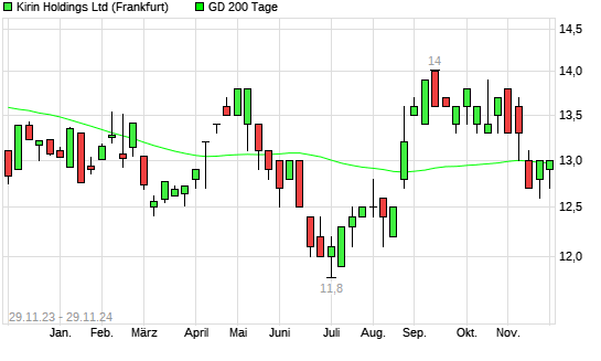 Mit dem Anstieg auf 13,00 EUR hat die Kirin Holdings-Aktie am 28.11.2024 die 200-Tage-Linie nach oben gekreuzt.