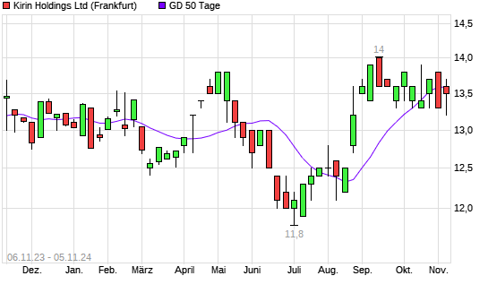 Mit dem Anstieg auf 13,70 EUR hat die Kirin Holdings-Aktie am 04.11.2024 die 50-Tage-Linie nach oben gekreuzt.