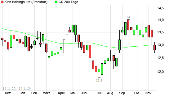 Mit dem Rücksetzer auf 12,70 EUR hat die Kirin Holdings-Aktie am 13.11.2024 die 200-Tage-Linie nach unten gekreuzt.
