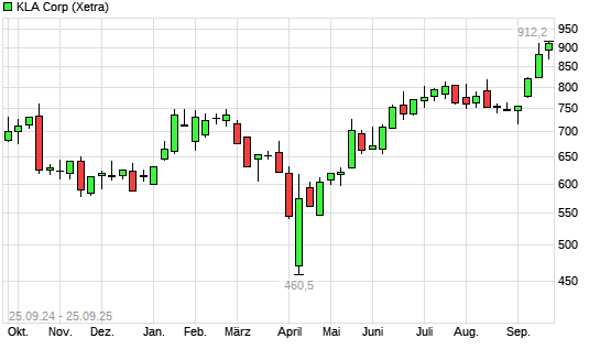Mit dem Anstieg auf 909,10 EUR hat die Kla-Tencor-Aktie (ISIN US4824801009) am 24.09.2025 ein neues All-Time-High erreicht und damit den Kurs vom 23.09.2025 eingestellt.