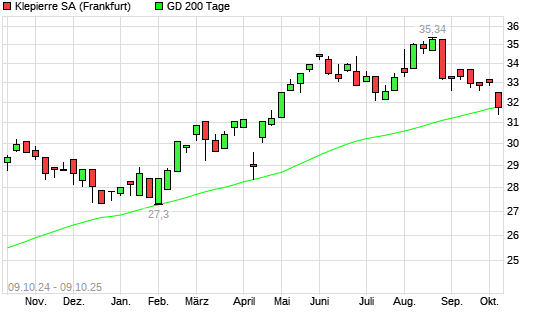 Mit dem Rücksetzer auf 31,40 EUR hat die Klepierre-Aktie am 08.10.2025 die 200-Tage-Linie nach unten gekreuzt.