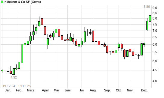 Mit dem Anstieg auf 8,58 EUR hat die Klöckner-Aktie (ISIN DE000KC01000) am 18.12.2025 ein neues 12-Monats-Hoch erreicht und damit den Kurs vom 17.12.2025 eingestellt.