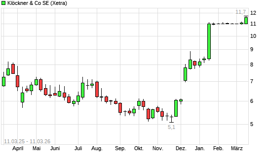 Mit dem Anstieg auf 11,56 EUR hat die Klöckner-Aktie (ISIN DE000KC01000) am 10.03.2026 ein neues 3-Jahres-Hoch erreicht und damit den Kurs vom 05.03.2026 eingestellt.