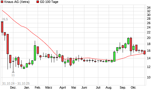 Mit dem Rücksetzer auf 15,06 EUR hat die Knaus Tabbert-Aktie am 30.10.2025 die 100-Tage-Linie nach unten gekreuzt.