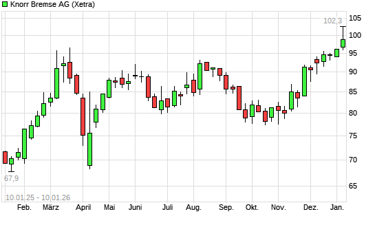 Mit dem Anstieg auf 100,20 EUR hat die Knorr-Bremse-Aktie (ISIN DE000KBX1006) am 09.01.2026 ein neues 3-Jahres-Hoch erreicht und damit den Kurs vom 07.01.2026 eingestellt.