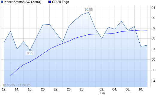 Mit dem Anstieg auf 88,85 EUR hat die Knorr-Bremse-Aktie am 10.06.2025 die 20-Tage-Linie nach oben gekreuzt.