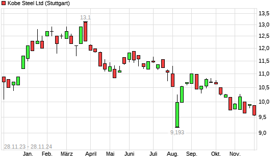 Mit dem Rücksetzer auf 9,09 EUR hat die Kobe Steel-Aktie (ISIN JP3289800009) am 27.11.2024 ein neues 12-Monats-Tief erreicht und damit den Kurs vom 05.08.2024 eingestellt.