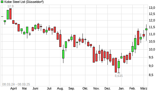 Mit dem Anstieg auf 11,65 EUR hat die Kobe Steel-Aktie (ISIN JP3289800009) am 07.03.2025 ein neues 6-Monats-Hoch erreicht und damit den Kurs vom 11.02.2025 eingestellt.