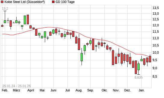 Mit dem Rücksetzer auf 9,40 EUR hat die Kobe Steel-Aktie am 24.01.2025 die 100-Tage-Linie nach unten gekreuzt.