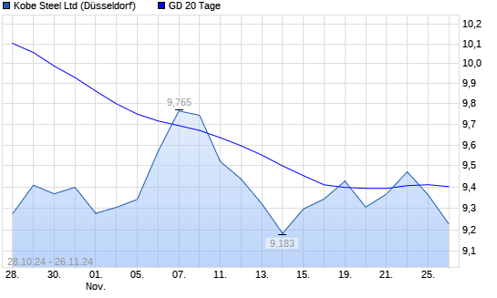 Mit dem Rücksetzer auf 9,39 EUR hat die Kobe Steel-Aktie am 25.11.2024 die 20-Tage-Linie nach unten gekreuzt.