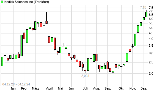Mit dem Anstieg auf 7,01 EUR hat die Kodiak Sciences-Aktie (ISIN US50015M1099) am 03.12.2024 ein neues 12-Monats-Hoch erreicht und damit den Kurs vom 28.03.2024 eingestellt.
