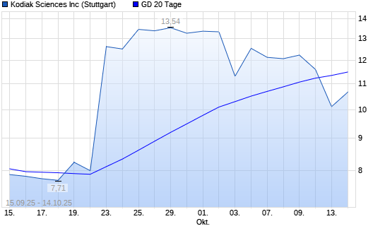 Mit dem Rücksetzer auf 10,31 EUR hat die Kodiak Sciences-Aktie am 13.10.2025 die 20-Tage-Linie nach unten gekreuzt.