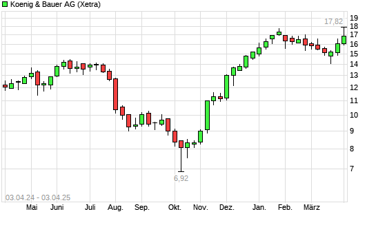Mit dem Anstieg auf 17,62 EUR hat die Koenig & Bauer-Aktie (ISIN DE0007193500) am 02.04.2025 ein neues 12-Monats-Hoch erreicht und damit den Kurs vom 24.01.2025 eingestellt.