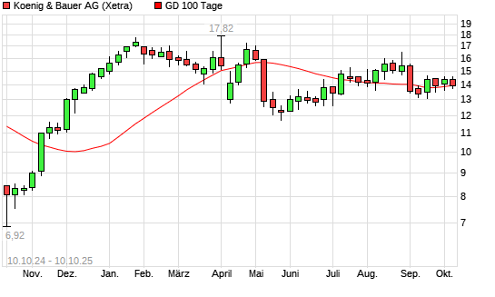 Mit dem Rücksetzer auf 13,80 EUR hat die Koenig & Bauer-Aktie am 09.10.2025 die 100-Tage-Linie nach unten gekreuzt.