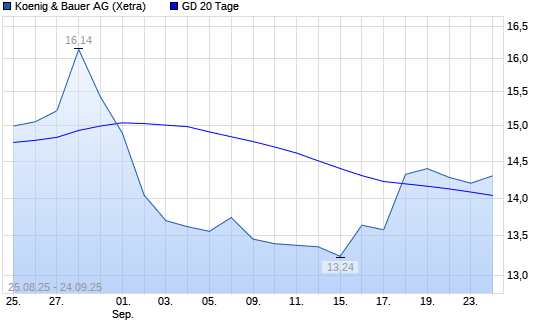 Mit dem Rücksetzer auf 14,08 EUR hat die Koenig & Bauer-Aktie am 23.09.2025 die 20-Tage-Linie nach unten gekreuzt.