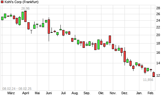 Mit dem Rücksetzer auf 11,86 EUR hat die Kohl's-Aktie (ISIN US5002551043) am 07.02.2025 ein neues 3-Jahres-Tief erreicht und damit den Kurs vom 15.01.2025 eingestellt.