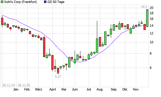 Mit dem Anstieg auf 19,30 EUR hat die Kohl's-Aktie am 25.11.2025 die 50-Tage-Linie nach oben gekreuzt.