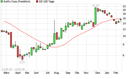 Mit dem Rücksetzer auf 15,71 EUR hat die Kohl's-Aktie am 13.02.2026 die 100-Tage-Linie nach unten gekreuzt.