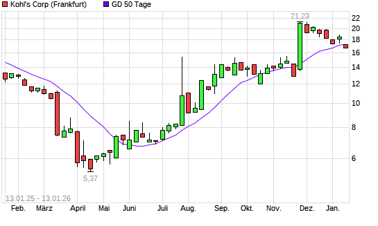 Mit dem Rücksetzer auf 17,30 EUR hat die Kohl's-Aktie am 12.01.2026 die 50-Tage-Linie nach unten gekreuzt.