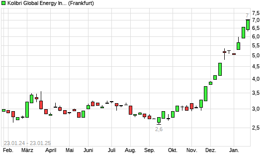 Mit dem Anstieg auf 6,60 EUR hat die Kolibri Global Energy-Aktie (ISIN CA50043K4063) am 22.01.2025 ein neues 10-Jahres-Hoch erreicht und damit den Kurs vom 17.01.2025 eingestellt.