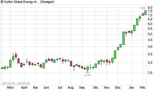 Mit dem Anstieg auf 7,55 EUR hat die Kolibri Global Energy-Aktie (ISIN CA50043K4063) am 07.02.2025 ein neues 10-Jahres-Hoch erreicht und damit den Kurs vom 31.01.2025 eingestellt.