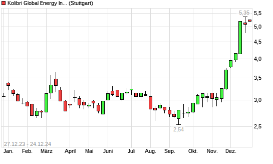 Mit dem Anstieg auf 5,25 EUR hat die Kolibri Global Energy-Aktie (ISIN CA50043K4063) am 23.12.2024 ein neues 5-Jahres-Hoch erreicht und damit den Kurs vom 20.12.2024 eingestellt.