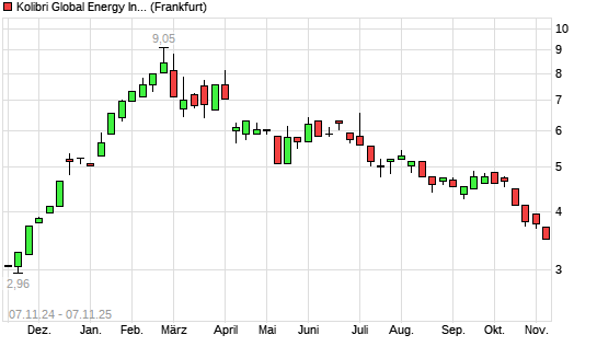 Mit dem Rücksetzer auf 3,56 EUR hat die Kolibri Global Energy-Aktie (ISIN CA50043K4063) am 06.11.2025 ein neues 6-Monats-Tief erreicht und damit den Kurs vom 05.11.2025 eingestellt.