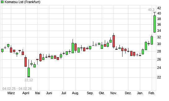 Mit dem Anstieg auf 36,32 EUR hat die Komatsu-Aktie (ISIN JP3304200003) am 03.02.2026 ein neues All-Time-High erreicht und damit den Kurs vom 02.02.2026 eingestellt.