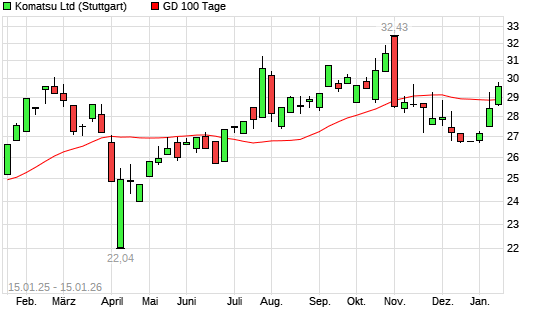 Mit dem Anstieg auf 29,10 EUR hat die Komatsu-Aktie am 14.01.2026 die 100-Tage-Linie nach oben gekreuzt.