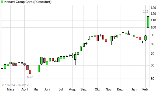 Mit dem Anstieg auf 120,00 EUR hat die Konami-Aktie (ISIN JP3300200007) am 06.02.2025 ein neues All-Time-High erreicht und damit den Kurs vom 05.02.2025 eingestellt.