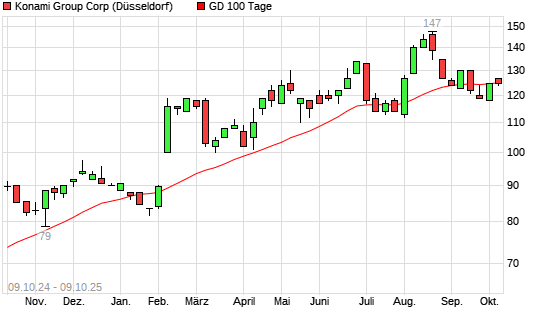 Mit dem Anstieg auf 127,00 EUR hat die Konami-Aktie am 08.10.2025 die 100-Tage-Linie nach oben gekreuzt.