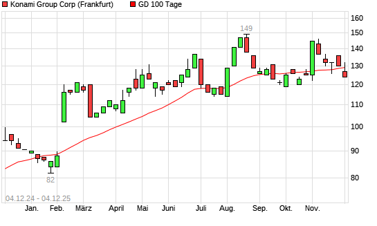 Mit dem Rücksetzer auf 125,00 EUR hat die Konami-Aktie am 03.12.2025 die 100-Tage-Linie nach unten gekreuzt.