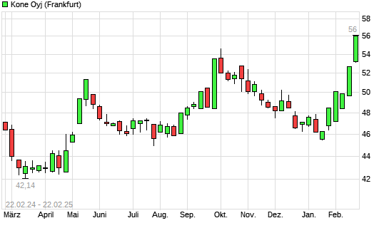 Mit dem Anstieg auf 56,00 EUR hat die Kone-Aktie (ISIN FI0009013403) am 21.02.2025 ein neues 3-Jahres-Hoch erreicht und damit den Kurs vom 30.09.2024 eingestellt.