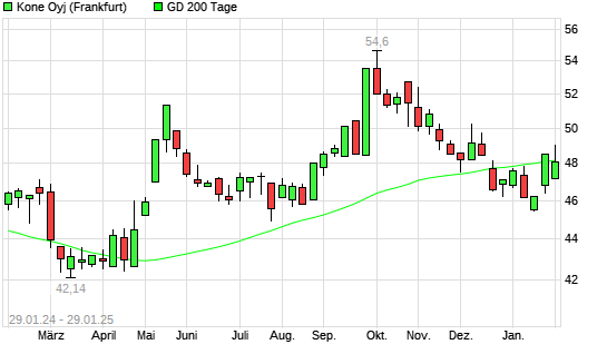 Mit dem Anstieg auf 49,05 EUR hat die Kone-Aktie am 28.01.2025 die 200-Tage-Linie nach oben gekreuzt.
