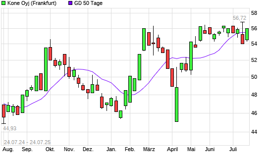 Mit dem Anstieg auf 55,62 EUR hat die Kone-Aktie am 23.07.2025 die 50-Tage-Linie nach oben gekreuzt.