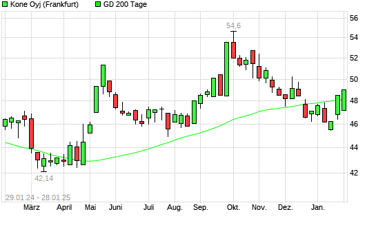 Mit dem Rücksetzer auf 48,17 EUR hat die Kone-Aktie am 27.01.2025 die 200-Tage-Linie nach unten gekreuzt.