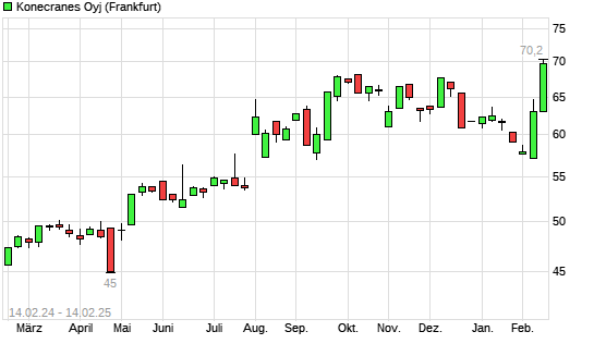 Mit dem Anstieg auf 68,55 EUR hat die Konecranes-Aktie (ISIN FI0009005870) am 13.02.2025 ein neues All-Time-High erreicht und damit den Kurs vom 12.02.2025 eingestellt.