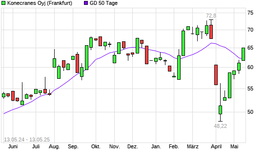Mit dem Anstieg auf 61,70 EUR hat die Konecranes-Aktie am 12.05.2025 die 50-Tage-Linie nach oben gekreuzt.