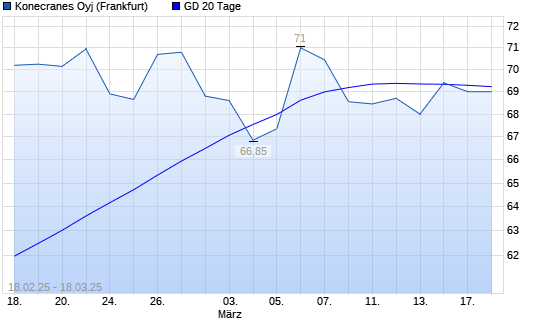 Mit dem Rücksetzer auf 69,00 EUR hat die Konecranes-Aktie am 17.03.2025 die 20-Tage-Linie nach unten gekreuzt.