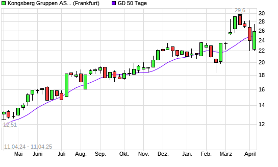 Mit dem Rücksetzer auf 124,35 EUR hat die Kongsberg-Aktie am 10.04.2025 die 50-Tage-Linie nach unten gekreuzt.Der Abstand zur 200-Tage-Linie beträgt aktuell +18,46%.
