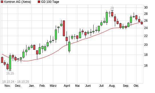 Mit dem Rücksetzer auf 25,30 EUR hat die Kontron-Aktie am 17.10.2025 die 100-Tage-Linie nach unten gekreuzt.