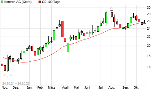 Mit dem Rücksetzer auf 25,32 EUR hat die Kontron-Aktie am 23.10.2025 die 100-Tage-Linie nach unten gekreuzt.