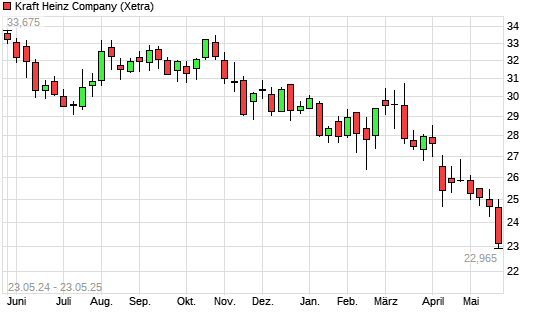Mit dem Rücksetzer auf 23,37 EUR hat die Kraft Heinz-Aktie (ISIN US5007541064) am 22.05.2025 ein neues 5-Jahres-Tief erreicht und damit den Kurs vom 21.05.2025 eingestellt.