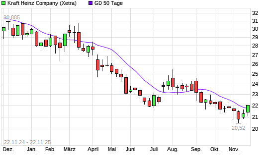 Mit dem Anstieg auf 22,10 EUR hat die Kraft Heinz-Aktie am 21.11.2025 die 50-Tage-Linie nach oben gekreuzt.