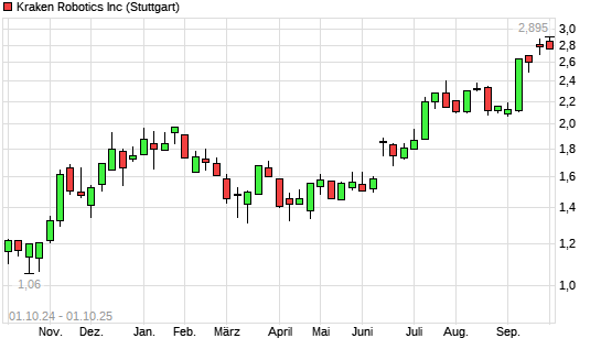 Mit dem Anstieg auf 2,86 EUR hat die Kraken Robotics-Aktie (ISIN CA50077N1024) am 30.09.2025 ein neues All-Time-High erreicht und damit den Kurs vom 29.09.2025 eingestellt.