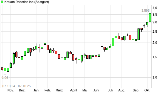 Mit dem Anstieg auf 3,41 EUR hat die Kraken Robotics-Aktie (ISIN CA50077N1024) am 06.10.2025 ein neues All-Time-High erreicht und damit den Kurs vom 03.10.2025 eingestellt.