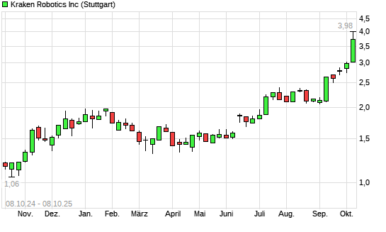 Mit dem Anstieg auf 3,68 EUR hat die Kraken Robotics-Aktie (ISIN CA50077N1024) am 07.10.2025 ein neues All-Time-High erreicht und damit den Kurs vom 06.10.2025 eingestellt.