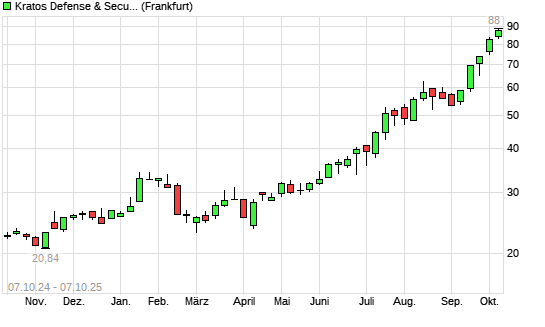 Mit dem Anstieg auf 84,68 EUR hat die Kratos Defense & Security Solutions-Aktie (ISIN US50077B2079) am 06.10.2025 ein neues 10-Jahres-Hoch erreicht und damit den Kurs vom 03.10.2025 eingestellt.