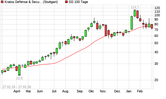 Mit dem Rücksetzer auf 74,02 EUR hat die Kratos Defense & Security Solutions-Aktie am 26.02.2026 die 100-Tage-Linie nach unten gekreuzt.