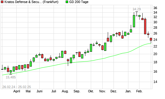 Mit dem Rücksetzer auf 22,99 EUR hat die Kratos Defense & Security Solutions-Aktie am 24.02.2025 die 200-Tage-Linie nach unten gekreuzt.